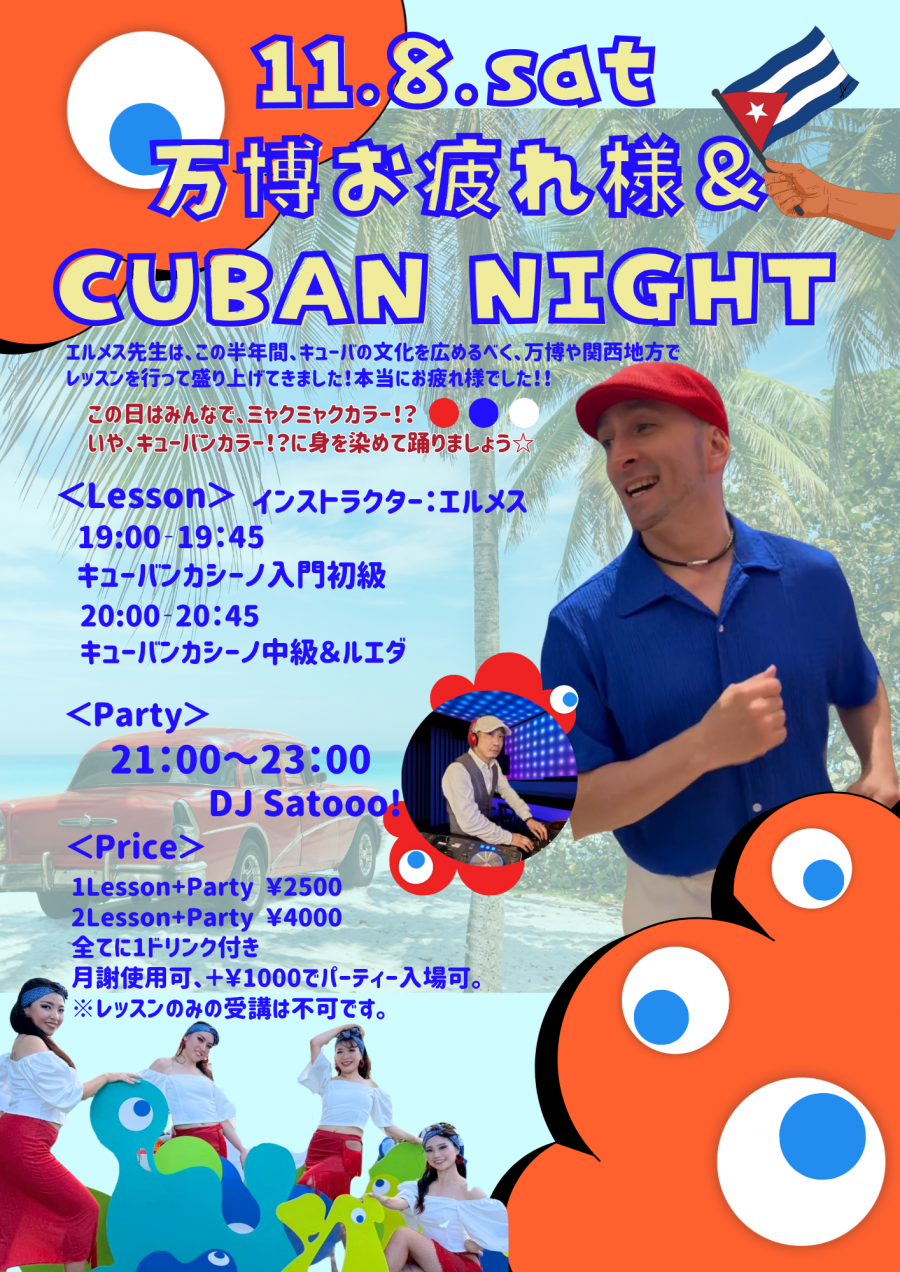 この日は、是非ミャクミャクカラー!?キューバンカラー!?を装ってみんなで盛大に踊りましょう~🎉🎉🎉パーティーでは、Hermes先生のアニマシオンでキューバパビリオンのミニレッスンを再現!!
